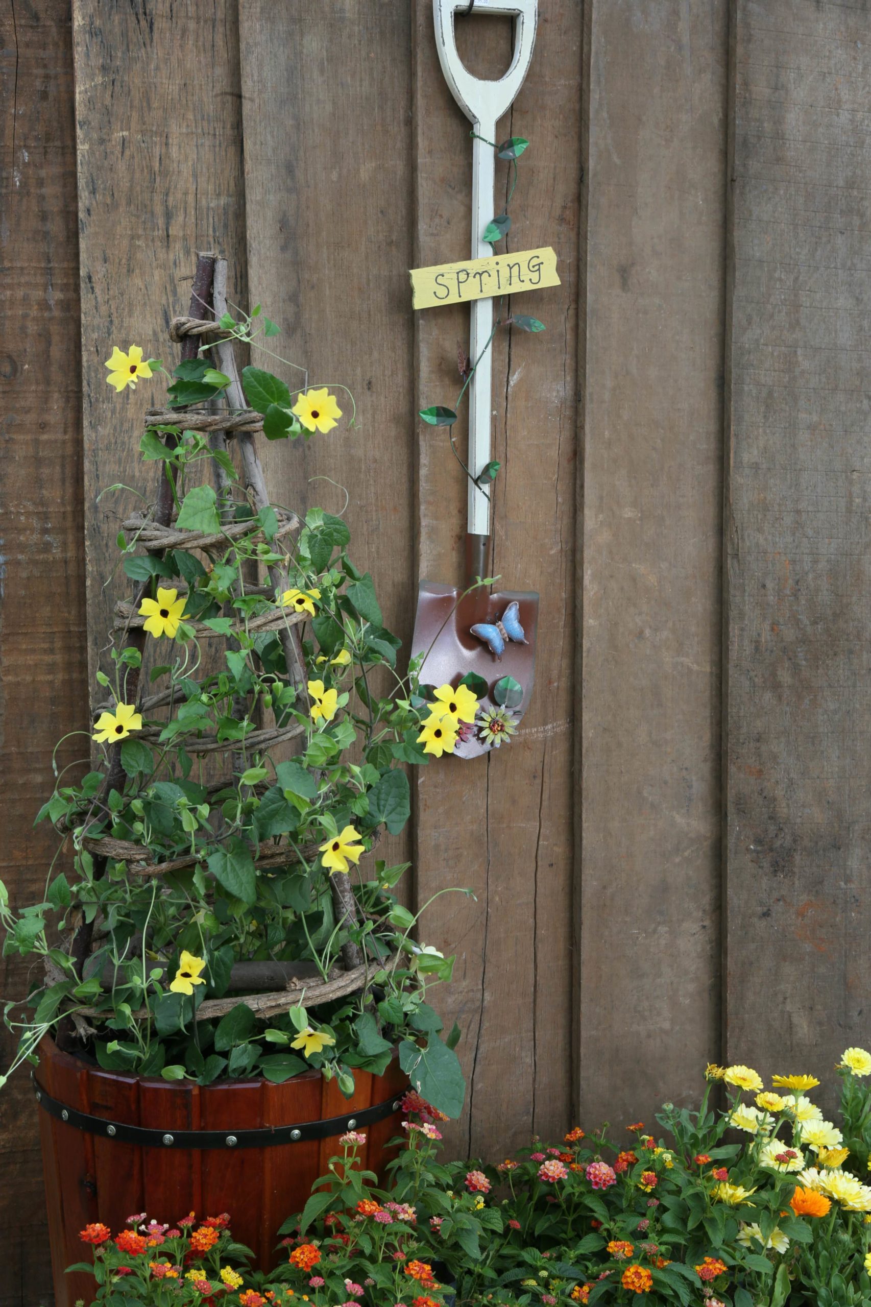 Conduzida em um suporte de cipó, a suzana-dos-olhos-negros fica parecendo uma arvorezinha