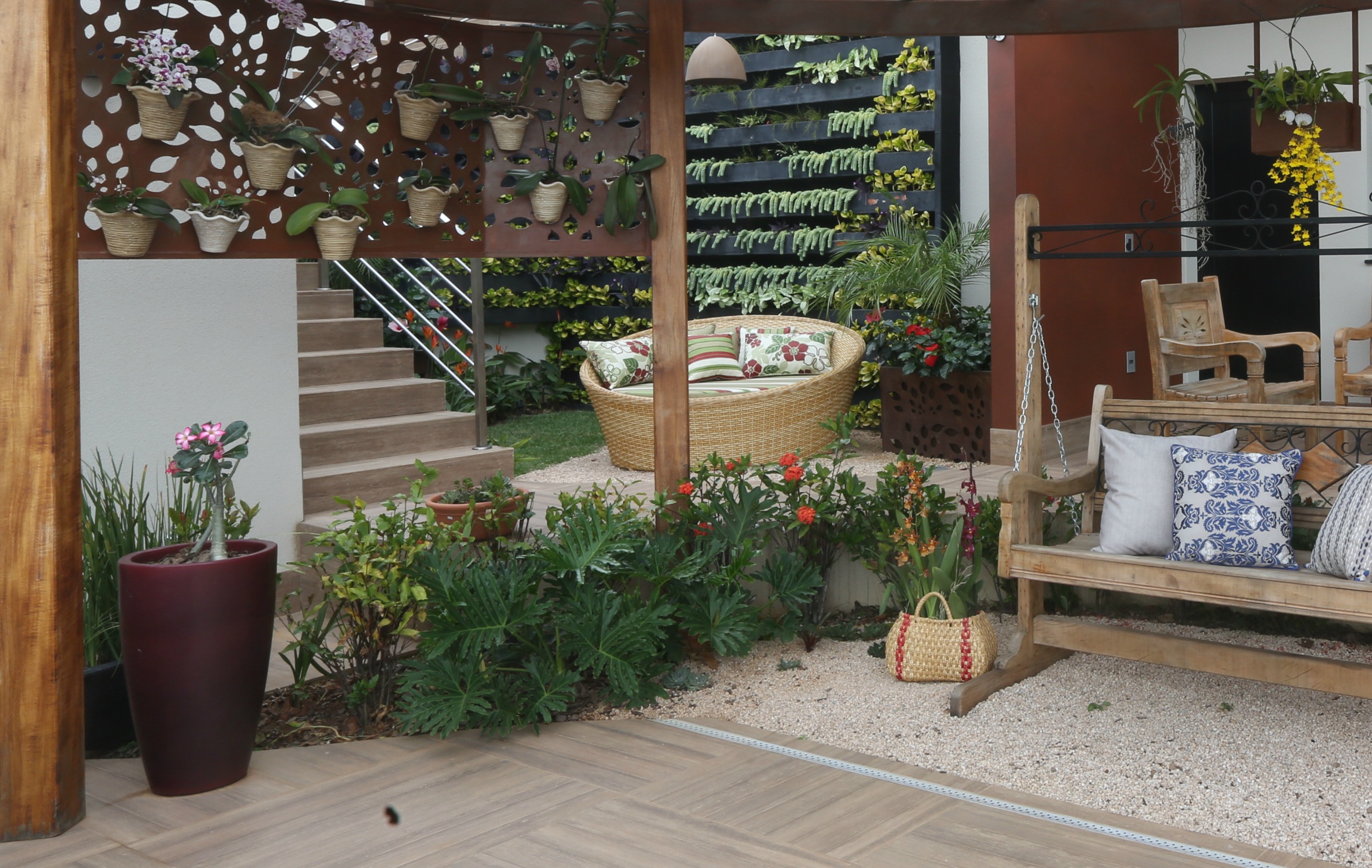 Com plantas cultivadas em paredes verdes e em vasos exclusivos, este jardim compacto esbanja charme e criatividade
