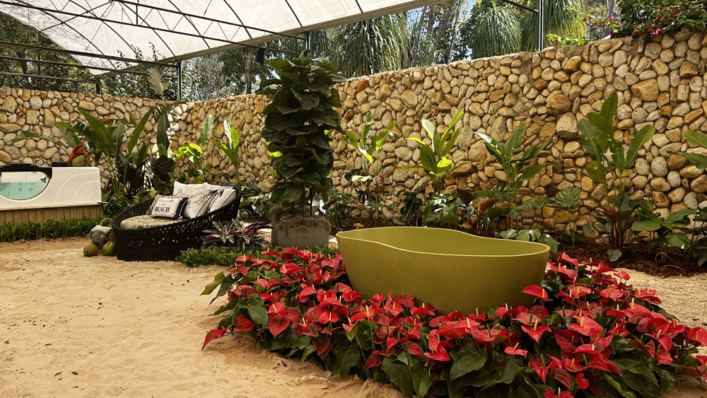 O jardim marca o retorno da artista plástica Marisa Trippia à mostra de paisagismo da Expoflora. Batizado de Encantos da Roça, transforma elementos do campo em um jardim criativo e muito colorido, cheio de referências do campo. Objetos do cotidiano, como chapéis de caubói e rodas de carro de boi, foram reaproveitados como elementos decorativos, criando um espaço que une memória, arte e sustentabilidade. O projeto combina espécies como kalanchoes-amarelos, helicônias e costelas-de-Adão, formando composições que reforçam a conexão com a natureza e a rusticidade do campo. A paleta de cores e os elementos manuais valorizam o “faça você mesmo”, mostrando como pequenos detalhes podem trazer identidade e afeto ao ambiente.