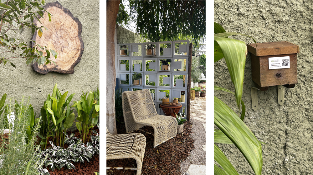 Entre as folhagens e flores usadas para compor o ambiente destacam-se alpínias, afelandas e peperômias. O projeto também inspira soluções que podem ser reproduzidas, como canteiros criativos, parede com fontes em vasos e a combinação de cores e texturas naturais para trazer acolhimento e bem-estar.