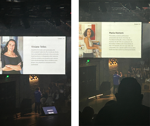 Em seguida, Viviane Teles apresentou sua pesquisa sobre “casas que curam”, mostrando como a arquitetura pode favorecer o equilíbrio físico e emocional. “Nós não somos artificiais, somos natureza também. A inteligência orgânica está nessa consciência de que o ambiente tem impacto direto sobre a saúde e a vitalidade de quem o habita.” Encerrando o painel, Maria Homem trouxe uma leitura psicanalítica e simbólica sobre o ato de construir e habitar. “Há milhares de anos, o ser humano constrói casas. E em cada abrigo que erguemos, deixamos também a marca da nossa imaginação e da nossa memória coletiva.”