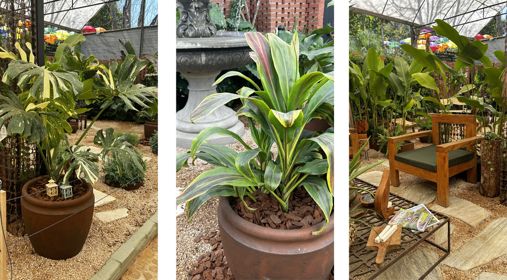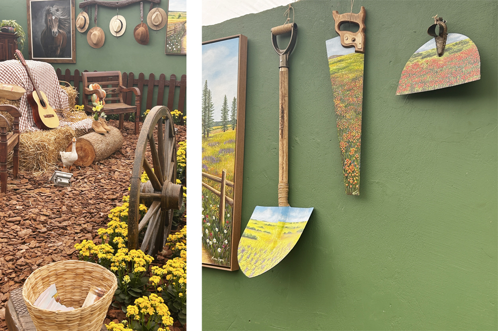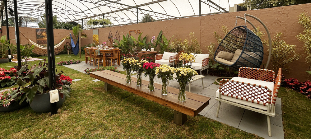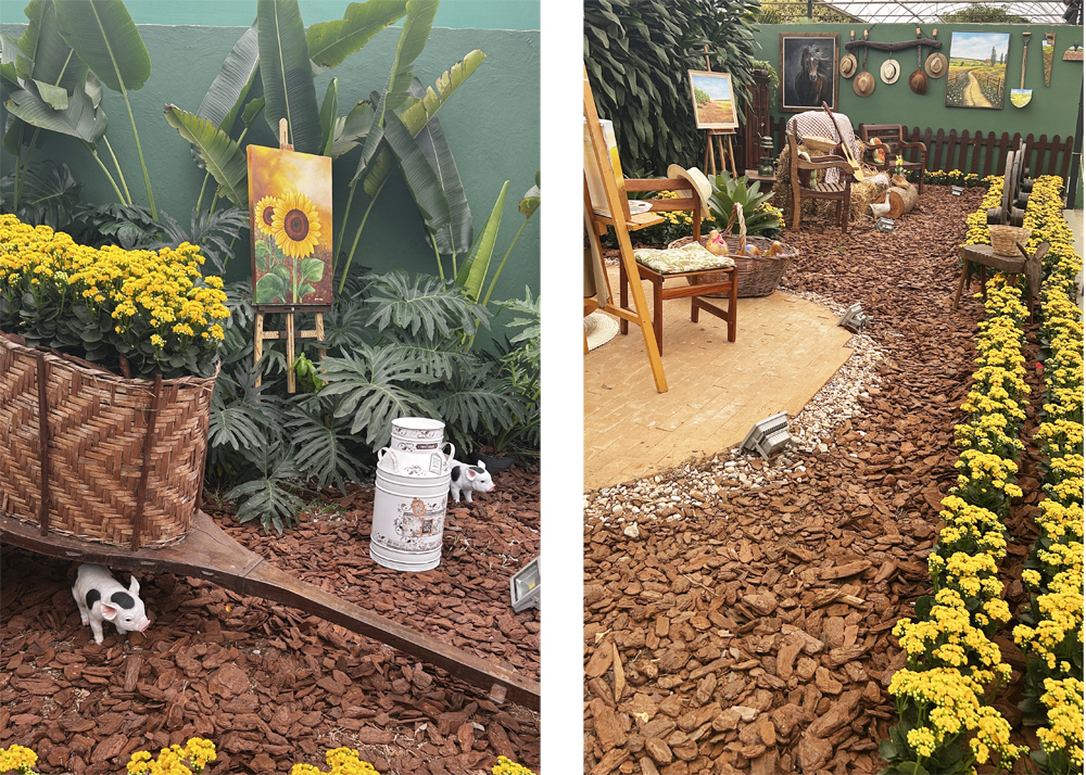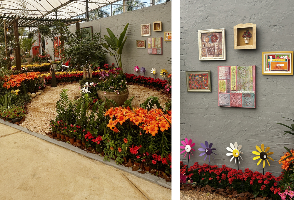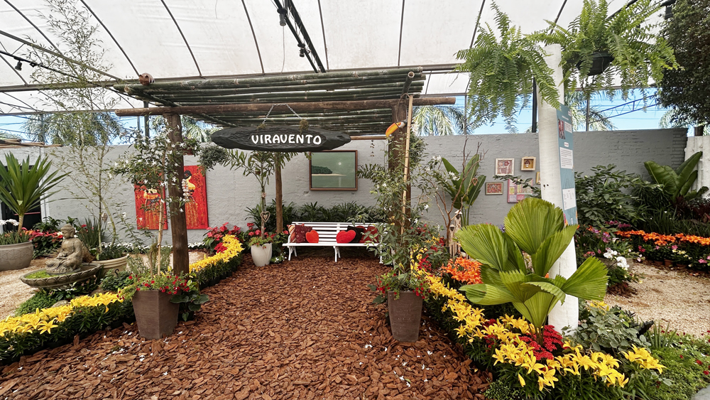 O jardim marca o retorno da artista plástica Marisa Trippia à mostra de paisagismo da Expoflora. Batizado de Encantos da Roça, transforma elementos do campo em um jardim criativo e muito colorido, cheio de referências do campo. Objetos do cotidiano, como chapéis de caubói e rodas de carro de boi, foram reaproveitados como elementos decorativos, criando um espaço que une memória, arte e sustentabilidade. O projeto combina espécies como kalanchoes-amarelos, helicônias e costelas-de-Adão, formando composições que reforçam a conexão com a natureza e a rusticidade do campo. A paleta de cores e os elementos manuais valorizam o “faça você mesmo”, mostrando como pequenos detalhes podem trazer identidade e afeto ao ambiente.