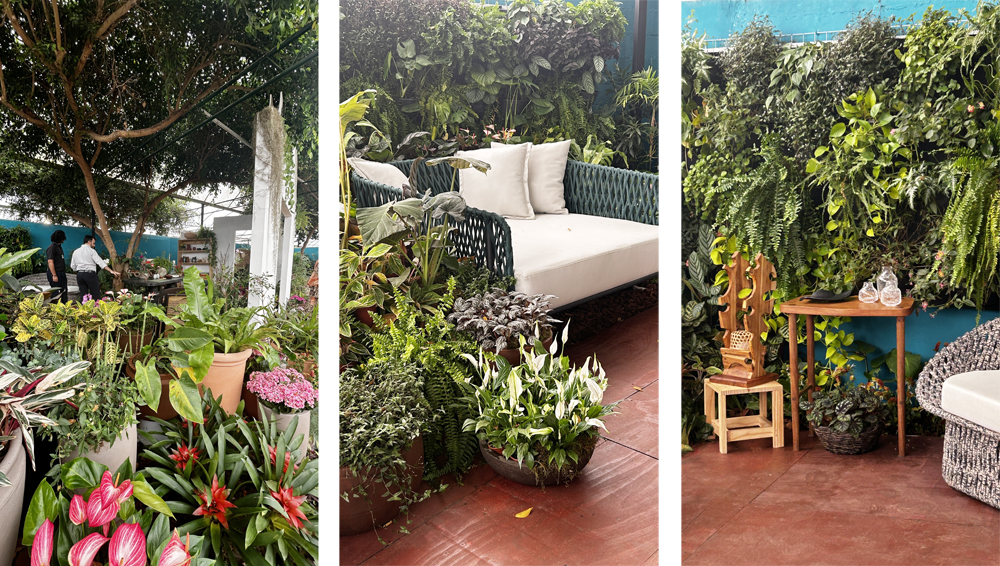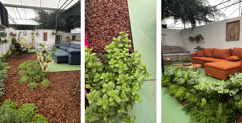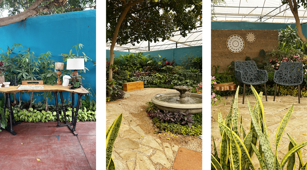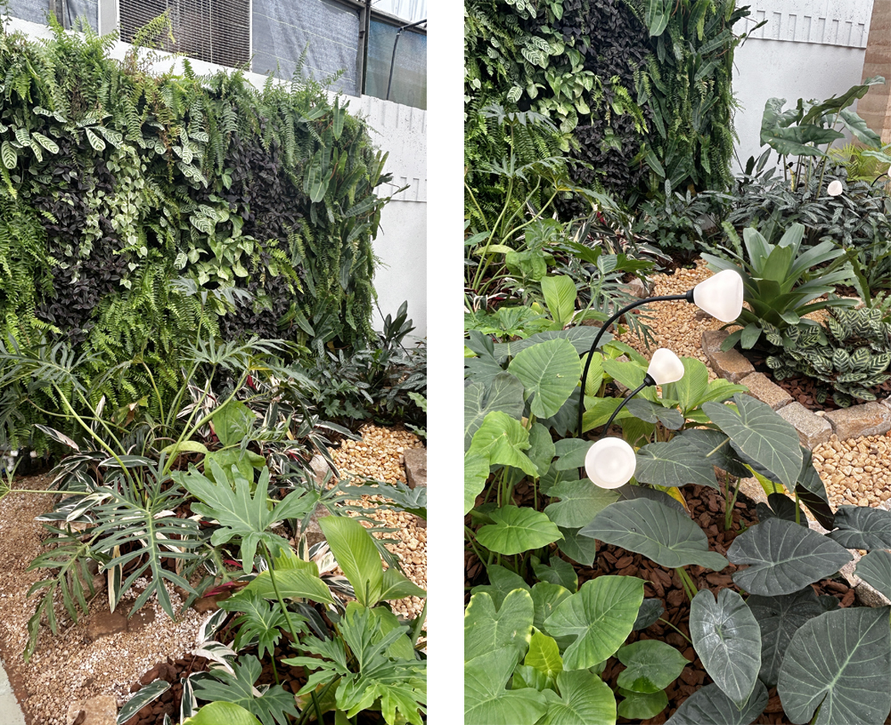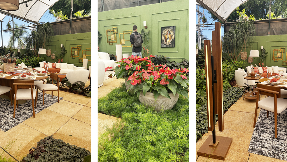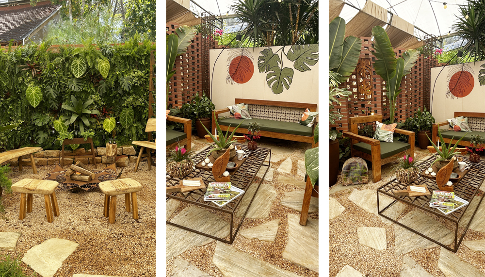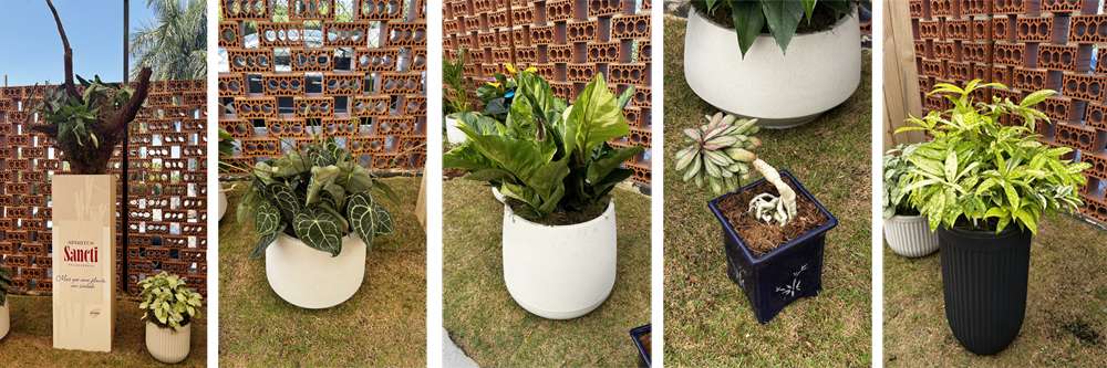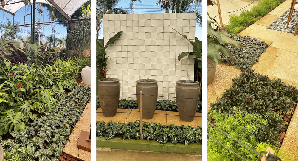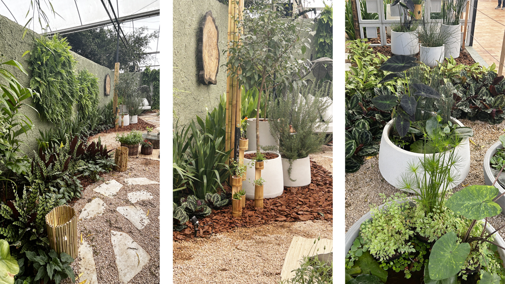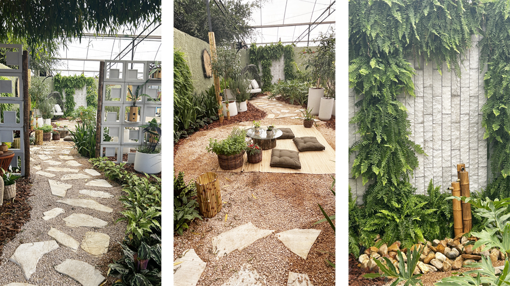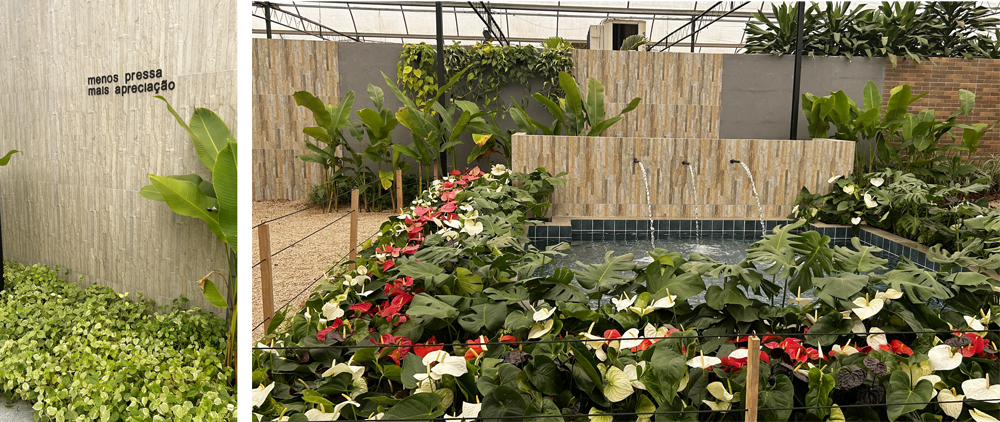 Entre as folhagens e flores usadas para compor o ambiente destacam-se alpínias, afelandas e peperômias. O projeto também inspira soluções que podem ser reproduzidas, como canteiros criativos, parede com fontes em vasos e a combinação de cores e texturas naturais para trazer acolhimento e bem-estar.