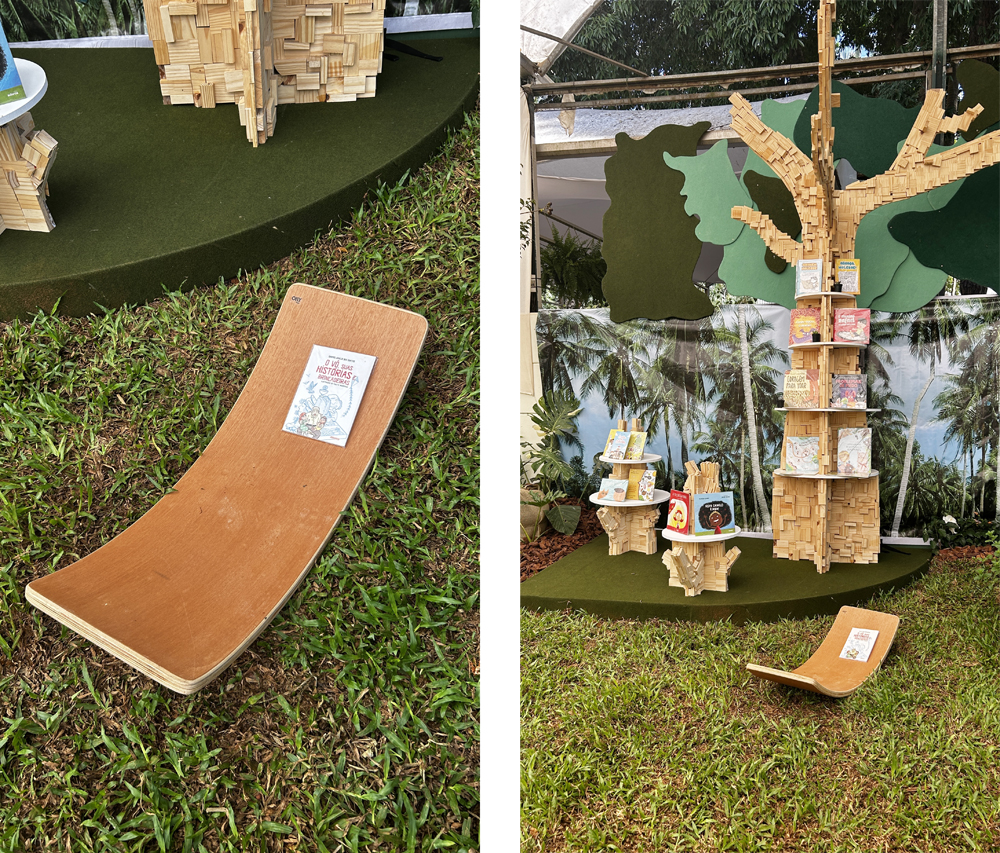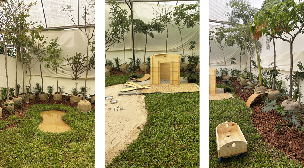 Em parceria com o Centro Paisagístico Gustaaf Winters, o projeto incorpora tendências como banho de floresta e waterfooting, que fortalecem a conexão com a natureza e auxiliam na regulação sensorial. O paisagismo prioriza espécies nativas e grama adequada para brincar, oferecendo liberdade com segurança. Destaque para a árvore literária, uma instalação construída com madeira reaproveitada da fábrica de brinquedos FFI (Fantástica Fabrica das Infâncias – Ecossistema da Ollytoys), marca de Stella que integra natureza, arte e literatura.
