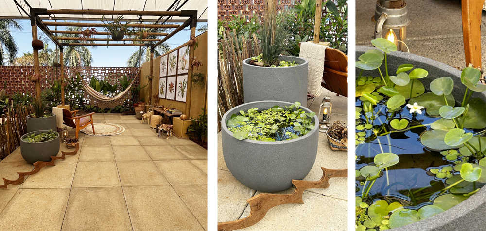 O espaço está organizado em três estações — acolhimento, relaxamento e descanso — e combina elementos como fontes e bacias aquáticas autossuficientes. Materiais sustentáveis e reaproveitados, como bambu, cordas e luminárias artesanais, reforçam a proposta ecológica. Mais do que contemplar, o jardim convida os visitantes a experimentar e criar experiências sensoriais próprias, inspirando soluções que podem ser aplicadas em casa para promover bem-estar, conexão com a natureza e estímulo aos sentidos.