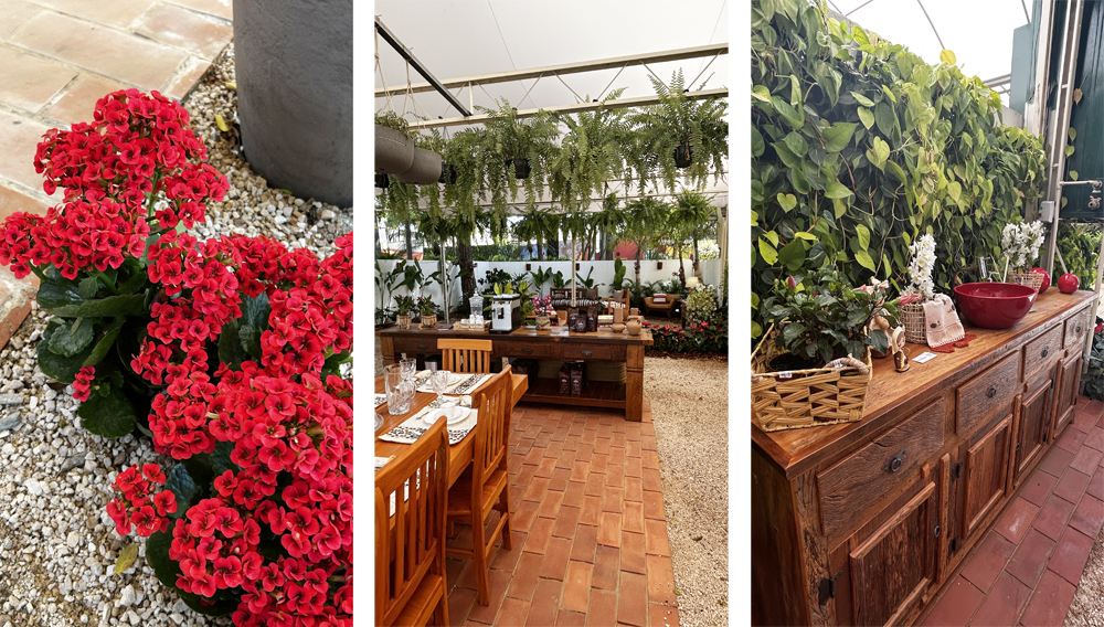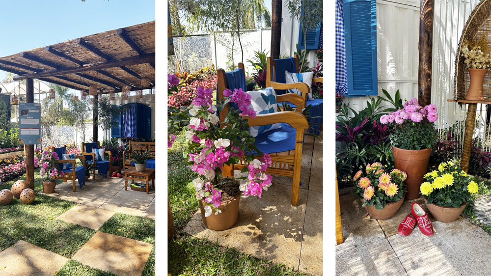 Assinado pela paisagista Neide Tobias, o espaço remete à simplicidade das casas do interior, com janelas antigas pintadas de azul, cortinas com estampa xadrez e móveis de madeira. O cenário combina espécies floridas, como buganvíleas e dálias, além de várias folhagens tipo crótons, begônias, dracenas-cordiline e guaimbês.