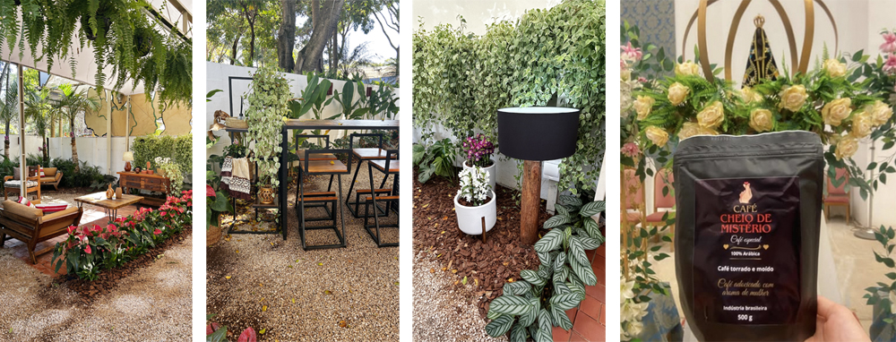 Entre as espécies usadas na decoração interna destacam-se kalanchoes vermelhos, antúrios, samambaias, marantas, jiboias e peperômias-pendentes que reforçam o estilo tropical do espaço. O cantinho do café funciona como ponto de pausa e contemplação para criar conexão com o cotidiano e o contato a natureza.