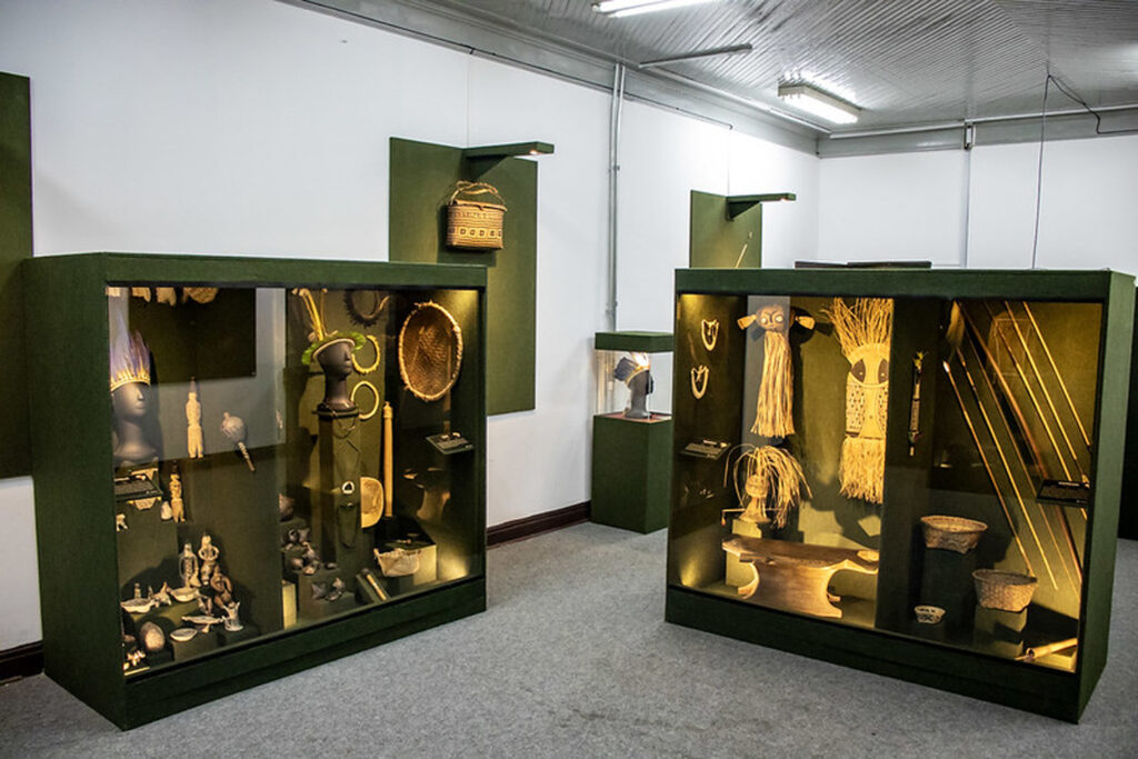 A expografia foi concebida para valorizar a materialidade das peças, com iluminação em tons quentes que ressaltam texturas, formas e cores dos elementos naturais. O resultado é uma experiência sensorial que aproxima o visitante das narrativas e dos saberes tradicionais.
